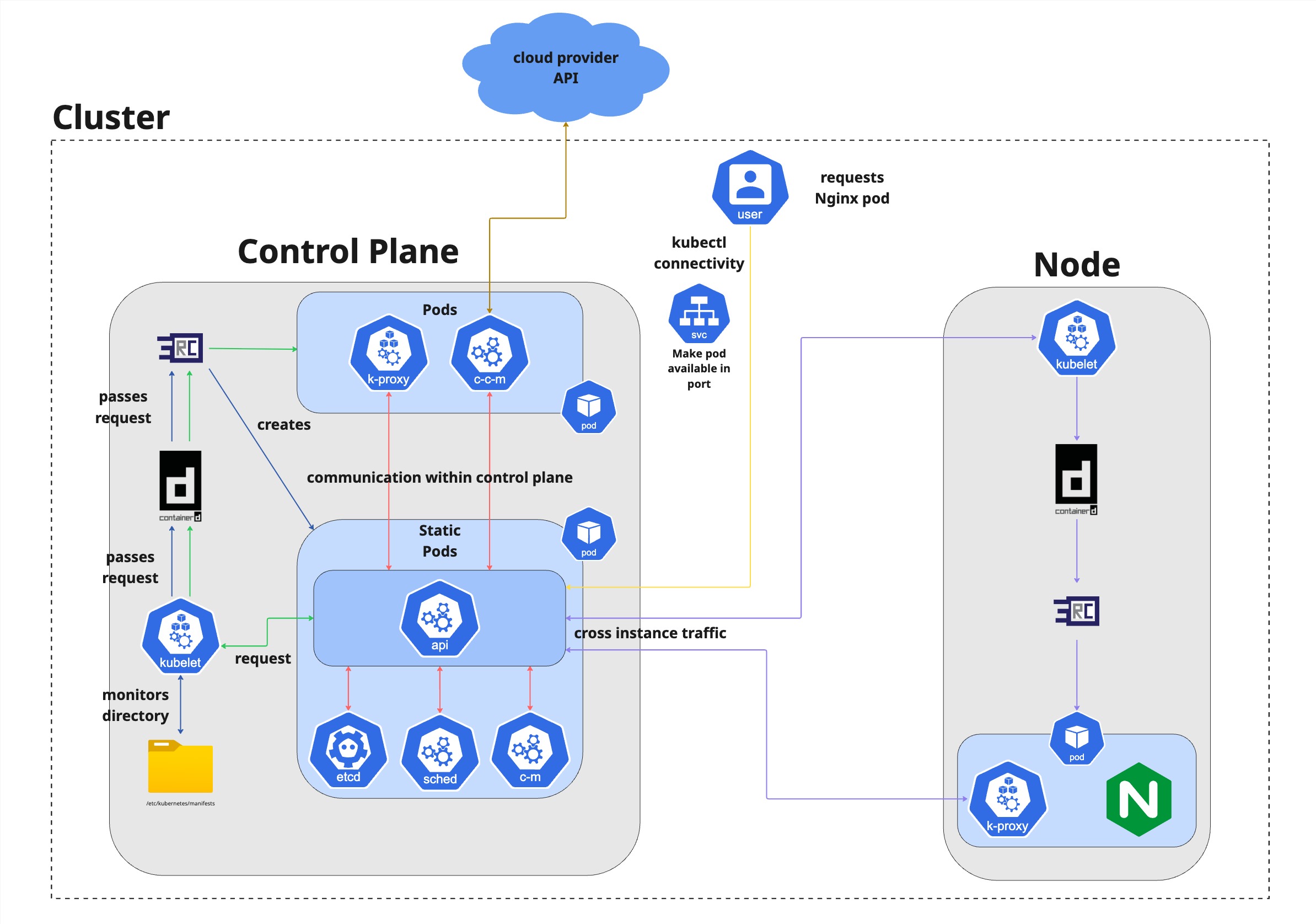 - Node: A physical or virtual machine managed by the control plane.